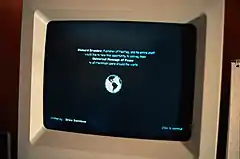 ![]() The MacMag virus's 'Universal Peace' message, as displayed on a Mac SE in March 1988 | |