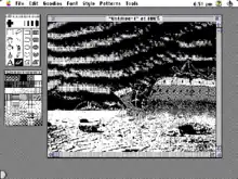 MacPaint 2.0 was released on January 11, 1988, by Claris.[18] It added many improvements to the software, including the capability to open and use up to nine documents simultaneously.[19] The original MacPaint operated as a single-document application with an immovable window. MacPaint 2.0 eliminated this limitation, introducing a fully functioning document window, which could be sized up to 8 x 10".[19] Several other features were introduced, such as a Zoom tool, MagicEraser tool for undo actions and stationary documents.[19] MacPaint 2.0 was developed by David Ramsey, a developer at Claris.[20] MacPaint 2.0 was sold for US$125, with a US$25 upgrade available for existing users of MacPaint.[19] Claris discontinued technical support for the original MacPaint in 1989.[21] Claris stopped selling MacPaint in early 1998 because of diminishing sales.[8] There has been an unofficial update called MacPaint X which is 3.0 beta, mainly for people who wished to be able to use the program.
