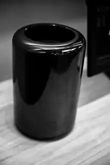During Cook's first few years as CEO, Apple fought media criticisms that it could no longer innovate without Jobs.[88] In 2013, Apple introduced a new cylindrical Mac Pro, with marketing chief Phil Schiller exclaiming "Can't innovate anymore, my ass!". The new model had a miniaturized design with a glossy dark gray cylindrical body and internal components organized around a central cooling system. Tech reviewers praised the 2013 Mac Pro for its power and futuristic design;[89][90] however, it was poorly received by professional users, who criticized its lack of upgradability and the removal of expansion slots.[91][92]