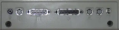 Expansion: Connectors on the rear panel include an ADB port for keyboard and mouse, two mini-DIN-8 RS-422 serial ports, DB-25 SCSI, DB-19 External floppy drive, and two 3.5 mm minijack audio sockets for audio in and headphone out.