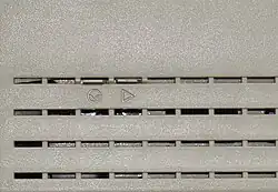 The interrupt (left) and reset (right) buttons protruding from the air vent on the lower left hand side of the Classic II. The interrupt button (also called the programmer's key) is used to access a debugger. |