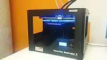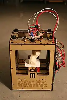 MakerBot Industries, LLC was an American desktop 3D printer manufacturer company headquartered in New York City. It was founded in January 2009 by Bre Pettis, Adam Mayer, and Zach "Hoeken" Smith to build on the early progress of the RepRap Project. It was acquired by Stratasys in June 2013. As of April 2016, MakerBot had sold over 100,000 desktop 3D printers worldwide.[1] Between 2009 and 2019, the company released 7 generations of 3D printers, ending with the METHOD and METHOD X.[2] It was at one point the leader of the desktop market with an important presence in the media, but its market share declined over the late 2010s.[3][4][5] MakerBot also founded and operated Thingiverse, the largest online 3D printing community and file repository.[6] In August 2022, the company completed a merger with its long-time competitor Ultimaker. The combined company is known as UltiMaker, but retains the MakerBot name for its Sketch line of education-focused 3D printers.[7]