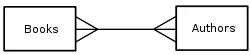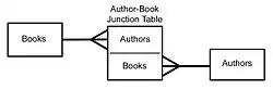 For example, think of A as Authors, and B as Books. An Author can write several Books, and a Book can be written by several Authors. In a relational database management system, such relationships are usually implemented by means of an associative table (also known as join table, junction table or cross-reference table), say, AB with two one-to-many relationships A → AB and B → AB. In this case the logical primary key for AB is formed from the two foreign keys (i.e. copies of the primary keys of A and B).