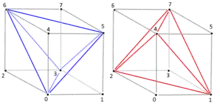 The cubical cells to be meshed can also be sliced into 5 tetrahedra,[3] using a (Diamond cubic) lattice as a basis. Cubes are mated on each side with another that has an opposite alignment of the tetrahedron around the centroid of the cube. Alternating vertices have a different number of tetrahedra intersecting on it, resulting in a slightly different mesh depending on position. When sliced this way, additional planes of symmetry are provided; having a tetrahedron around the centroid of the cube also generates very open spaces around points that are outside of the surface.