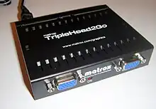 It is similar to TripleHead2Go, except it supports only 2 displays. When setting output to 1024x768 per display, the refresh rate can be set up to 85 Hz. It has maximum resolution of 2560×1024@60 Hz (1280×1024 each). It was later renamed to DualHead2Go Analog Edition.