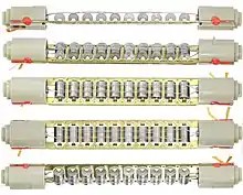 There are a great many combinations of resonators and transducers that can be used to construct a mechanical filter. A selection of some of these is shown in the diagrams. Figure 6 shows a filter using disc flexural resonators and magnetostrictive transducers. The transducer drives the centre of the first resonator, causing it to vibrate. The edges of the disc move in antiphase to the centre when the driving signal is at, or close to, resonance, and the signal is transmitted through the connecting rods to the next resonator. When the driving signal is not close to resonance, there is little movement at the edges, and the filter rejects (does not pass) the signal.[44] Figure 7 shows a similar idea involving longitudinal resonators connected together in a chain by connecting rods. In this diagram, the filter is driven by piezoelectric transducers. It could equally well have used magnetostrictive transducers.[33] Figure 8 shows a filter using torsional resonators. In this diagram, the input has a torsional piezoelectric transducer and the output has a magnetostrictive transducer. This would be quite unusual in a real design, as both input and output usually have the same type of transducer. The magnetostrictive transducer is only shown here to demonstrate how longitudinal vibrations may be converted to torsional vibrations and vice versa.[33][42][45] Figure 9 shows a filter using drumhead mode resonators. The edges of the discs are fixed to the casing of the filter (not shown in the diagram) so the vibration of the disc is in the same modes as the membrane of a drum. Collins calls this type of filter a disc wire filter.[42]