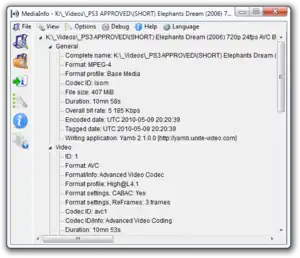 MediaInfo is a free, cross-platform and open-source program that displays technical information about media files, as well as tag information for many audio and video files. It is used in many programs such as XMedia Recode, MediaCoder, eMule, and K-Lite Codec Pack.[4] It can be easily integrated into any program using a supplied MediaInfo.dll. MediaInfo supports popular video formats (e.g. Matroska, WebM, AVI, WMV, QuickTime, Real, DivX, XviD) as well as lesser known or emerging formats.[5] In 2012 MediaInfo 0.7.57 was also distributed in the PortableApps format.[6]