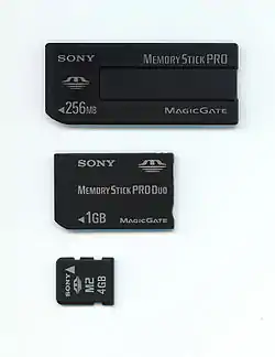 ![]() From top to bottom: Memory Stick PRO, Memory Stick PRO Duo, Memory Stick Micro (M2) | |