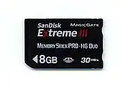 Sony has released different versions of Memory Stick PRO Duo. A Memory Stick PRO Duo with MagicGate was released as a 512 MB stick. Additionally, a 16 GB version in March 2008 and another a 32 GB version on August 21, 2009.[28] In 2009, Sony and SanDisk also announced the joint development of an expanded Memory Stick PRO format tentatively named "Memory Stick PRO Format for Extended High Capacity".[29] Sony has since finalized the format and released its specification under the new name, Memory Stick XC (see below).[30]