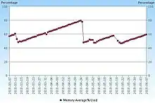 A "sawtooth" pattern of memory utilization may be an indicator of a memory leak within an application, particularly if the vertical drops coincide with reboots or restarts of that application. Care should be taken though because garbage collection points could also cause such a pattern and would show a healthy usage of the heap.