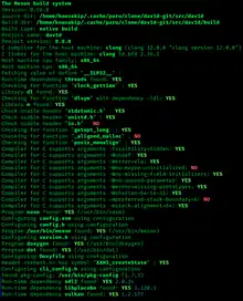 Meson supports GNU Compiler Collection, Clang, Microsoft Visual C++ and other compilers, including non-traditional compilers such as Emscripten and Cython.[5] The project uses ninja as the primary backend buildsystem, but can also use Microsoft Visual Studio or Xcode backends.