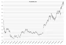Trading in the stock, which began on May 18, was delayed that day due to technical problems with the Nasdaq exchange.[31] The stock struggled to stay above the IPO price for most of the day, forcing underwriters to buy back shares to support the price.[32] At the closing bell, shares were valued at $38.23,[33] only $0.23 above the IPO price and down $3.82 from the opening bell value. The opening was widely described by the financial press as a disappointment.[34] The stock nonetheless set a new record for trading volume of an IPO.[35] On May 25, 2012, the stock ended its first full week of trading at $31.91, a 16.5% decline.[36]