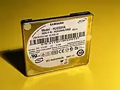 Samsung entered the microdrive market at a very late stage in 2008 with announced capacities of 20, 30 and 40 GB.[26] Doing away with the bulky compact flash II connector, Samsung Spinpoint A1 microdrives were able to use a 1.3" diameter disk, while keeping the same outer microdrive dimensions (42.8mmx32.4mmx5mm). They also used perpendicular recording technology which had just been introduced in the hard disk industry. At the time when flash memory was becoming the medium of choice for all portable application, Samsung's entry was very short lived, with only one product carrying the 30 GB model known to ship: JVC's Everio GZ-MG73, an ultra-slim camcorder[27]