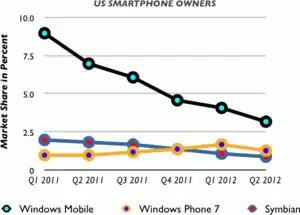 Following the second quarter of 2013, Nokia reported an operating loss of €115 million (£98.8 million), with revenues falling 24% to €5.7 billion, despite Lumia's sales figures exceeding those of BlackBerry's handsets during the same period. Over the nine-quarters prior to the second quarter of 2013, Nokia sustained €4.1 billion worth of operating losses. The company experienced particular problems in both China and the U.S.; in the former, Nokia's handset revenues were the lowest since 2002, while in the U.S., "Nokia continues to show no signs of recovery in the US market. High investments, high expectations, low results."[41] In July 2013, Nokia announced that Lumia sales were 7.4 million for the second quarter of the year – a record high,[42] but Windows Phones in general still lacked momentum and lacked global market share, although scoring progressively better than other competing mobile platforms such as BlackBerry.[43]
