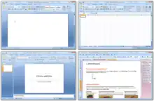 ![]() Microsoft Office 2007 applications shown on Windows Vista – clockwise from top left: Word, Excel, OneNote and PowerPoint. These four programs make up the Home and Student edition. | |