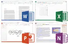 ![]() Microsoft Office 2013 applications from top left to bottom right: Word, Excel, PowerPoint and OneNote which collectively make up the Home and Student edition. | |