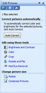Basic image editing features include color correct, crop, flip, resize, and rotate. Advanced features include brightness, contrast, hue, and saturation adjustment; batch processing; compression; and red-eye removal.[15] An AutoCorrect command can automatically adjust brightness, contrast, and color. All editing capabilities are listed on an Edit Pictures task pane.[12] Images can be compressed with options for insertion into documents, email, or web pages.[16] After editing, users can view or discard unsaved changes, overwrite the original image, rename and save the new image, or export it to another location. Users can also share images in email, to an intranet location, or to a SharePoint library.[7] Picture Manager users running Windows 2000 cannot print images from the application, as this feature requires a wizard distributed with Windows XP.[17]