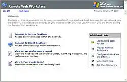 The Remote Web Workplace is a feature of Microsoft's Windows Small Business Server, Windows Home Server 2011, and the midsize business-focused product, Windows Essential Business Server, which enables existing users to log into a front-end network-facing interface of the small business/home server.