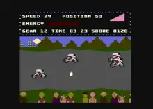 The player's bike moves from side to side to avoid potholes or other riders during the cycling race, which is conducted on a path that scrolls horizontally. The rider topples upon making contact with any danger, and valuable time is lost while he remounts. There are 12 gears on the bike, and as higher speeds are selected, the speed increases. The cyclist's energy is reduced as a bar on the screen decreases towards zero. The race must be abandoned if the cyclist is completely exhausted, however touching the milk bottles that frequently appear by the side of the road can restore energy reserves. There is the clock issue in addition to the energy issue. A timer counts down on several of the time trial stages. The race again ends early if the course isn't finished before the timer reaches zero.