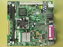Mini-ITX is a 170 mm × 170 mm (6.7 in × 6.7 in) motherboard form factor developed by VIA Technologies in 2001.[1] Mini-ITX motherboards have been traditionally used in small-configured computer systems. Originally, Mini-ITX was a niche standard designed for fanless cooling with a low power consumption architecture, which made them useful for home theater PC systems, where fan noise can detract from the cinema experience.