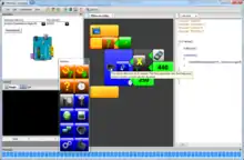 Since the v0.82 version,[5] miniBloq includes miniSim: a small 2D robot simulator, aimed specially for kids. It's a very simple tool to help teaching basic robot programming to kids whom do not own a real robot. miniBloq features some simple blocks that controls a small simulated robot with some remembrances to Logo, where the robot can draw a small environment (a maze, for example) and then use a sensor to interact with that environment. miniSim is under the same license as miniBloq, and has been programmed in Python, using PyGame. miniSim is the official simulator software used by the Educ.Ar educational program from the Argentine Government.[6]