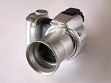 Minolta created a new category of "bridge cameras," with the introduction of the DiMAGE 7. Designed for use by people familiar with 35mm single-lens reflex (SLR) cameras but without the added cost or complication of interchangeable lenses or optical reflex viewfinders, the DiMAGE incorporated many of the features of a higher-level film camera with the simplicity of smaller compact digicams. The camera had a traditional zoom ring and focus ring on the lens barrel and was equipped with an electronic viewfinder (EVF) rather than the direct optical reflex view of an SLR. It added other features such as a histogram, and the cameras were compatible with Minolta's flashes for modern film SLRs.