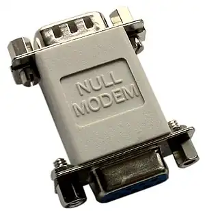 A null modem adapter is a small device with plugs at both ends which is placed on the termination of a normal "straight-through" serial cable to convert it into a null-modem cable.