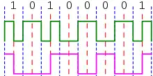 Data: 1 1 0 1 0 0 1 0 0 0 1 0 0 0 0 1 0 0 0 0 0 1 Clock: 0 0 0 0 0 1 0 0 1 0 0 0 1 0 1 0 0 1 0 1 0 0 Encoded: 01010001001001001000010010001001001000100001