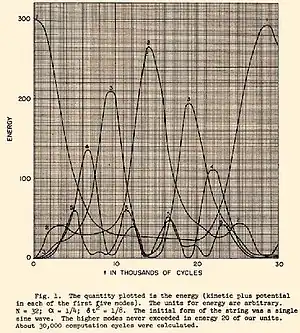 Following the discovery of microscopic particles and the development of computers, interest expanded beyond the proving ground of gravitational systems to the statistical properties of matter. In an attempt to understand the origin of irreversibility, Enrico Fermi proposed in 1953, and published in 1955,[3] the use of the early computer MANIAC I, also at Los Alamos National Laboratory, to solve the time evolution of the equations of motion for a many-body system subject to several choices of force laws. Today, this seminal work is known as the Fermi–Pasta–Ulam–Tsingou problem. The time evolution of the energy from the original work is shown in the figure to the right.