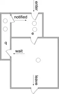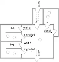 As a variation on this scheme, the notified thread may be moved to a queue called w, which has priority over e. See Howard[4] and Buhr et al.[5] for further discussion.