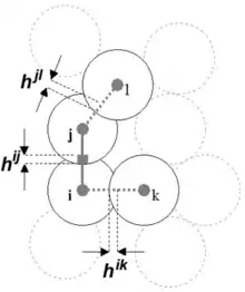 The εij parameter is used as a measure of deformation of automaton i under its interaction with automaton j. Where qij – is a distance from the center of automaton i to its contact point with automaton j; Ri = di/2 (di – is the size of automaton i).