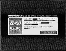 Movieland, also known as Movieland.com, Moviepass.tv and Popcorn.net, was a subscription-based movie download service that has been the subject of thousands of complaints to the Federal Trade Commission, the Washington State Attorney General's Office, the Better Business Bureau, and other agencies by consumers who said they were held hostage by its repeated pop-up windows and demands for payment, triggered after a free 3-day trial period. Many said they had never even heard of Movieland until they saw their first pop-up. Movieland advertised that the service had "no spyware", and that no personal information would need to be filled out to begin the free trial.[1]