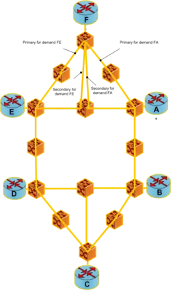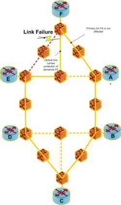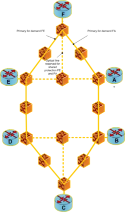 Shared backup path protection (SBPP) for multicast connections: The SBPP technique can be used for multicast connections at the optical layer because of its resource efficiency, due to the fact that the backup paths can share wavelength channels on links while their corresponding primary paths are link disjoint. Paths can share links with working paths and protection paths of other leaves. In a shared backup path protection before failure FE and FA are primary paths. The optical line is reserved for shared protection of both FE and FA.