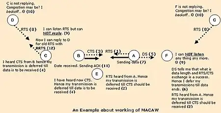 Multiple Access with Collision Avoidance for Wireless (MACAW)[1] is a slotted medium access control (MAC) protocol widely used in ad hoc networks.[2] Furthermore, it is the foundation of many other MAC protocols used in wireless sensor networks (WSN).[2] The IEEE 802.11 RTS/CTS mechanism is adopted from this protocol.[3][4] It uses RTS-CTS-DS-DATA-ACK frame sequence for transferring data, sometimes preceded by an RTS-RRTS frame sequence, in view to provide solution to the hidden node problem.[1] Although protocols based on MACAW, such as S-MAC, use carrier sense in addition to the RTS/CTS mechanism, MACAW does not make use of carrier sense.[1]