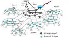 Inside every island or access network a bridge is automatically elected to behave as the Root Bridge, this one bridge will behave as a gateway, allowing the forwarding of frames from the core to an island and conversely. Just one Abridge is going to perform these gateway functions, although many could be connected. Communication among 802.1D bridges and between standard 802.1D bridges and ABridges does not require point-to-point connections.