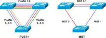 Each instance defines a single forwarding topology for an exclusive set of VLANs, by contrast, STP or RSTP networks contains only a single spanning tree instance for the entire network, which contains all the VLANs. A region can include:[1]