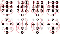 Cycles of the unit digit of multiples of integers ending in 1, 3, 7 and 9 (upper row), and 2, 4, 6 and 8 (lower row) on a telephone keypad