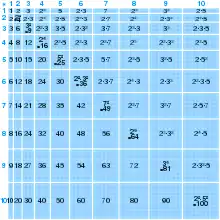 Multiplication table from 1 to 10 drawn to scale with the upper-right half labeled with prime factorisations