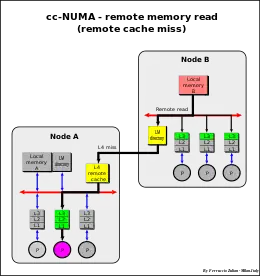To overcome this limit, a large remote cache (see Remote cache) is normally used. With this solution, the cc-NUMA system becomes very close to a large SMP system.
