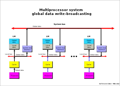 Each time the global data is modified in a local memory, a hardware write-broadcasting is sent to the system bus to all other local memories to maintain the global data coherency. Thus, global data may be read by each processor accessing its own local memory without involving the system bus. System bus access is only required when global data is modified in a local memory to update the copy of this data stored in the other local memories.