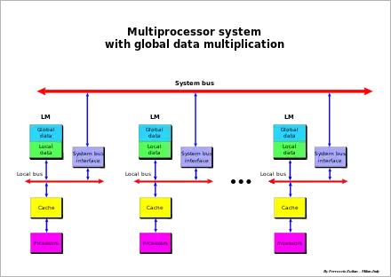 The basic concept of this architecture is to have global data, which is modifiable information, accessible by all processors. This information is duplicated and stored in each local memory of each processor.