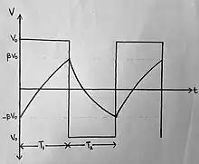 We are taking values of R, C and β such that we get a symmetrical square wave. Thus, we get T1 = T2 and total time period T = T1 + T2. So, the time period of the square wave generated at the output is:
