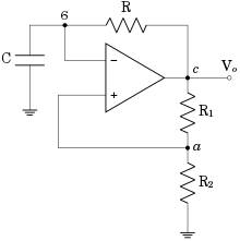 Assume all the capacitors to be discharged at first. The output of the op-amp Vo at node c is +Vsat initially. At node a, a voltage of +β Vsat is formed due to voltage division where . The current that flows from nodes c and b to ground charges the capacitor C towards +Vsat. During this charging period, the voltage at b becomes greater than +β Vsat at some point. The voltage at inverting terminal will be greater than the voltage at the non-inverting terminal of the op-amp. This is a comparator circuit and hence, the output becomes -Vsat. The voltage at node a becomes -βVsat due to voltage division. Now the capacitor discharges towards -Vsat. At some point, the voltage at b becomes less than -β Vsat. The voltage at the non-inverting terminal will be greater than the voltage at the inverting terminal of the op-amp. So, the output of the op-amp is +Vsat. This repeats and forms a free-running oscillator or an astable multivibrator.