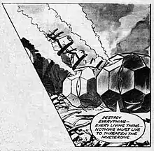 Solo merged with the TV Tornado comic the following week, with the Mysteron strip running in the latter publication from issues 36 to 58. In the second instalment, when a Mysteron party lands on the planet Andorme, the atmosphere restores the hitherto disembodied creatures to visibility in "… the ancient Mysteron shape". In this form they are depicted as spherical, polyhedral beings, with three of the faces having "eye slits", one of which can emit a destructive energy beam.[8]