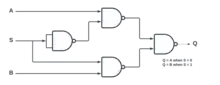 | Q = [ A AND NOT( S ) ] OR ( B AND S ) | = [ A NAND ( S NAND S ) ] NAND ( B NAND S ) | ||||||||||||||||||||||||||||||||||||
