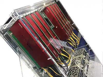 The NEC SX-Aurora TSUBASA is a vector processor of the NEC SX architecture family.[1][2] Unlike previous SX supercomputers, the SX-Aurora TSUBASA is provided as a PCIe card, termed by NEC as a "Vector Engine" (VE).[2] Eight VE cards can be inserted into a vector host (VH) which is typically a x86-64 server running the Linux operating system.[2] The product has been announced in a press release on 25 October 2017 and NEC has started selling it in February 2018.[3] The product succeeds the SX-ACE.