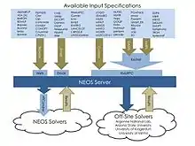 The NEOS Server is an Internet-based client-server application that provides access to a library of optimization solvers. The server accepts optimization models described in modeling languages, programming languages, and problem-specific formats. Most of the linear programming, integer programming and nonlinear programming solvers accept input from AMPL and/or GAMS. Jobs can be submitted via a web page, email, XML RPC, Kestrel[7] or indirectly via third party submission tools SolverStudio for Excel, OpenSolver, Pyomo, JuMP (through the Julia package NEOS[8]) and the R package rneos. NEOS uses the HTCondor software to manage the workload on a dedicated cluster of computers.[9]