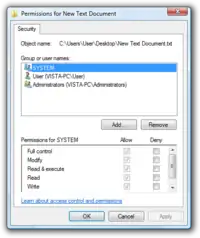 In NTFS, each file or folder is assigned a security descriptor that defines its owner and contains two access control lists (ACLs). The first ACL, called discretionary access control list (DACL), defines exactly what type of interactions (e.g. reading, writing, executing or deleting) are allowed or forbidden by which user or groups of users. For example, files in the C:\Program Files folder may be read and executed by all users but modified only by a user holding administrative privileges.[49] Windows Vista adds mandatory access control info to DACLs. DACLs are the primary focus of User Account Control in Windows Vista and later.