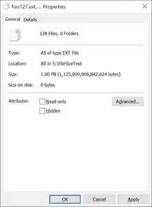 | Max file size | 16 EB[lower-alpha 1] − 1 KB (format); 16 TB − 64 KB (Windows 7, Windows Server 2008 R2 or earlier implementation)[5] 256 TB − 64 KB (Windows 8, Windows Server 2012 or later implementation)[7] 8 PB − 2 MB (Windows 10 version 1709, Windows Server 2019 or later implementation)[6] |