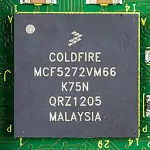 The NXP ColdFire is a microprocessor that derives from the Motorola 68000 family architecture, manufactured for embedded systems development by NXP Semiconductors. It was formerly manufactured by Freescale Semiconductor (formerly the semiconductor division of Motorola) which merged with NXP in 2015.